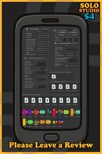 You can easily change the ship, asteroids, UI, visuals, sound effects, movement, spawning, scoring, difficulty settings, or add new mechanics such as enemies, power-ups, or weapons. Because every feature is separated into logical systems, you can remove or replace parts without breaking the template.