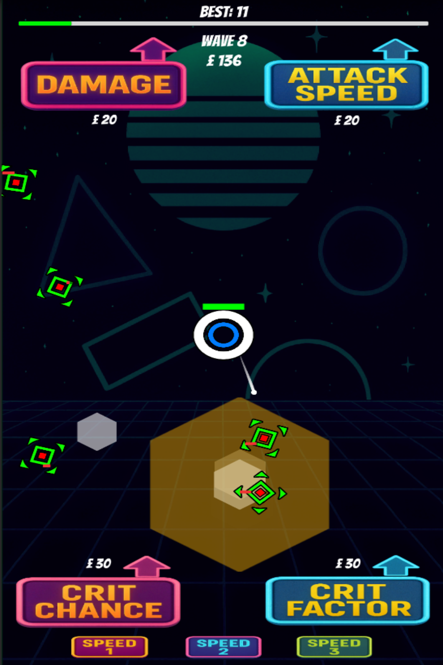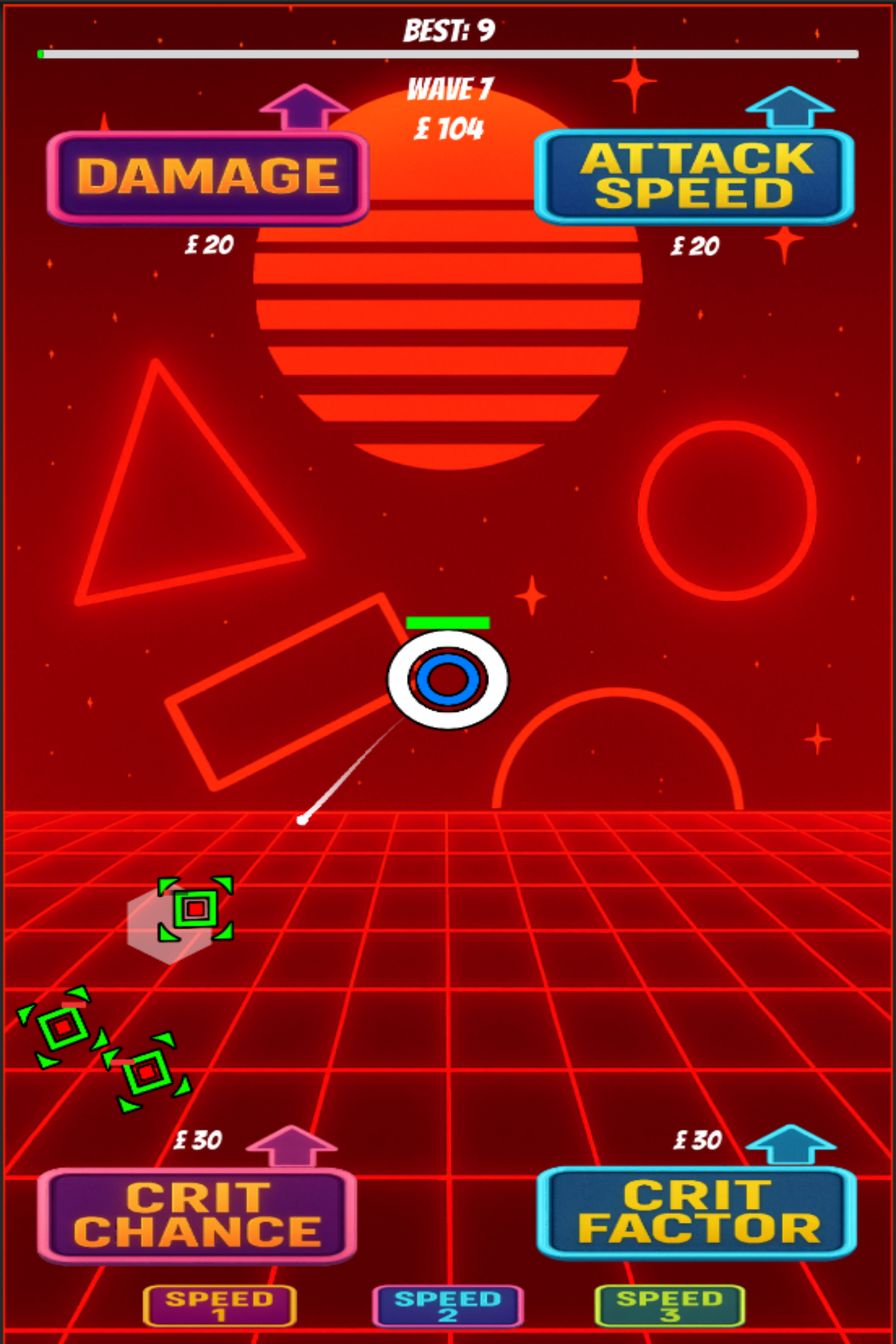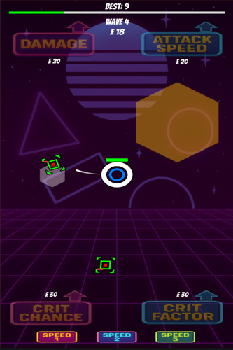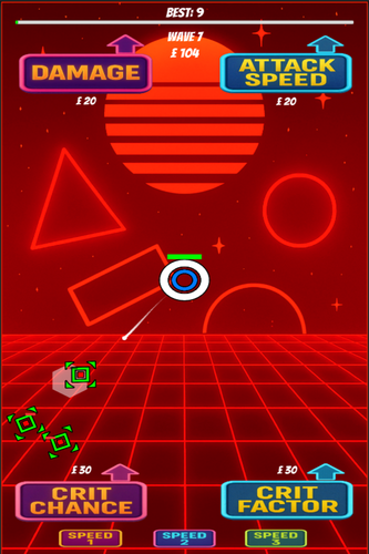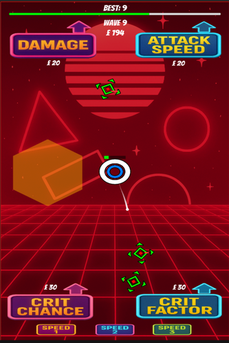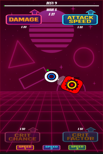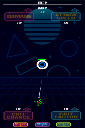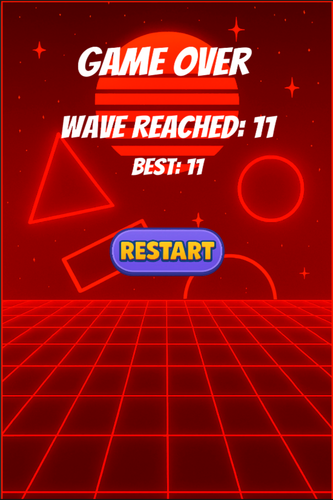The tower auto-fires bullets at incoming enemies with varied movement styles, including direct, orbit, wobble, and noise patterns. Enemies attack, retreat, and respawn across randomized waves, keeping gameplay dynamic. Every few waves, a miniboss appears with boosted stats and extra rewards. Players can spend money on upgrades such as damage, attack speed, critical chance, critical factor, tower HP, and regeneration. The game ends when the tower’s health is depleted, with a game over panel showing wave reached and best score.